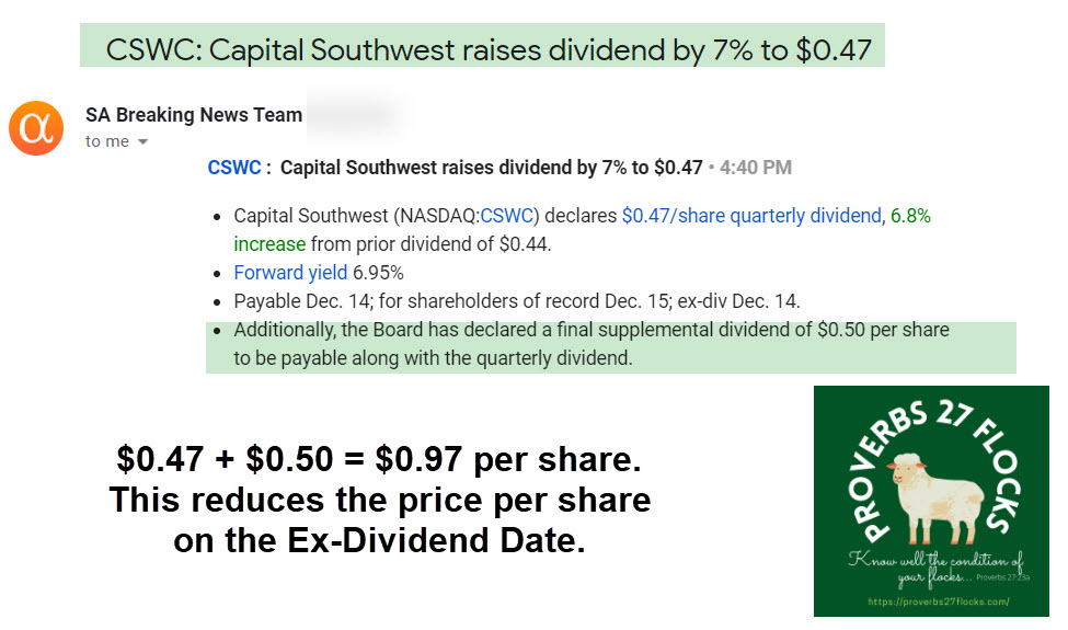 The next dividend payments from CSWC in December are nothing to ignore. In addition to increasing their quarterly dividend by almost 7%, they are paying an additional supplemental dividend of $0.50 per share. That works out to a dividend of $0.97 per share. Therefore, in December we will receive combined dividends of $2,328. Let’s call that a nice Christmas bonus!