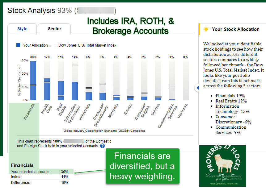 Because of these broad ETF’s, our total exposure to financials is about 30% of our total investments. You cannot get this mix by investing in the S&P 500 index. For example, SPY (SPDR S&P 500 Trust ETF) is only 13.9% financials.