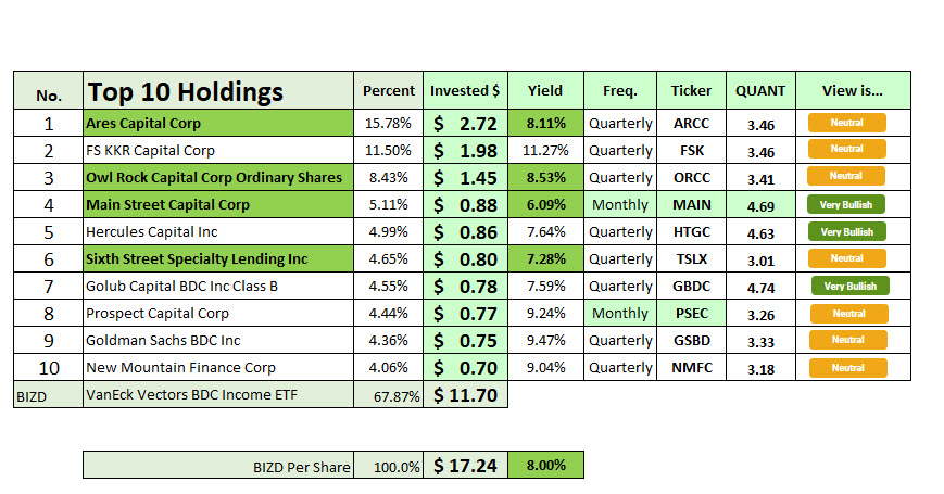 You don’t have to buy the stocks of individual Business Development Companies (BDCs) but sometimes you might do well to press the pause button before buying something specialized like BIZD. BIZD is “VanEck Vectors BDC Income ETF.” It has a yield of 8.02% so it seems like a good idea. I did some digging, and what I discovered caused me to stick with my custom solution. My custom solution is to pick individual BDC company stocks like ARCC, ORCC, MAIN, and TSLX.
