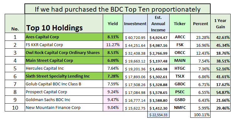 If you look at the five-year results for their 26 holdings, half of them (13) have declined in value in the last five years. While some of their picks have nice gains, the extra garbage they have included in their mix creates an overall drag on their returns. Three of the 26 that had good 5-year returns are smaller investments. If you look at the following illustrations, you will see BIZD’s one-year gain and five-year gains for their top ten.
