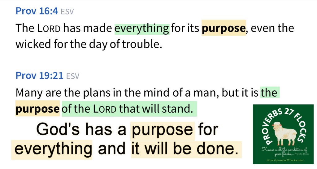 The question is, “how do I determine my purpose?” The answer, I believe, can be found in God’s creation (the things he spoke into existence), his word (by this I mean the right interpretation of the Old and New Testament scriptures), and the living Word (John 1:1), Jesus. The first one should cause you to ask some questions, the second one should help you find the answers, and the third one is the way, the truth, and the life for the person who can have right purpose.