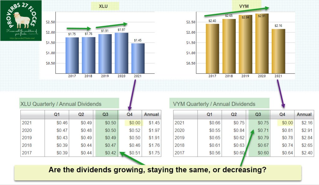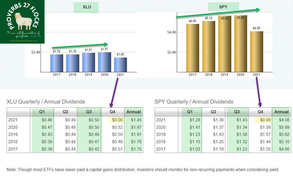 The tool is simple to use. The following screens illustrate how I use it. You can start by looking at the default when you go to the link. The comparison is for two ETFs: XLU and SPY. Scroll down and you will notice that on the bar graphs it looks like the dividends decreased in 2021. That isn’t necessarily the case. The dividends for the fourth quarter have not been declared. Therefore, sometimes it is better to look at the numbers in the tables.