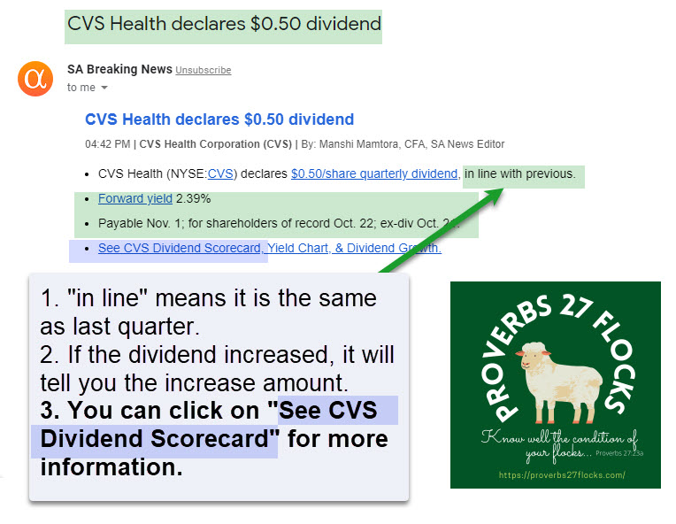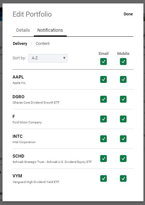 The advantage of this approach is that it can be used for ETF’s and for individual stocks like AAPL, F, and NFLX. If any of the ETFs or companies have news related to dividends, you will receive an email notifying you of the dividend. Here is an example or an email I received this week: