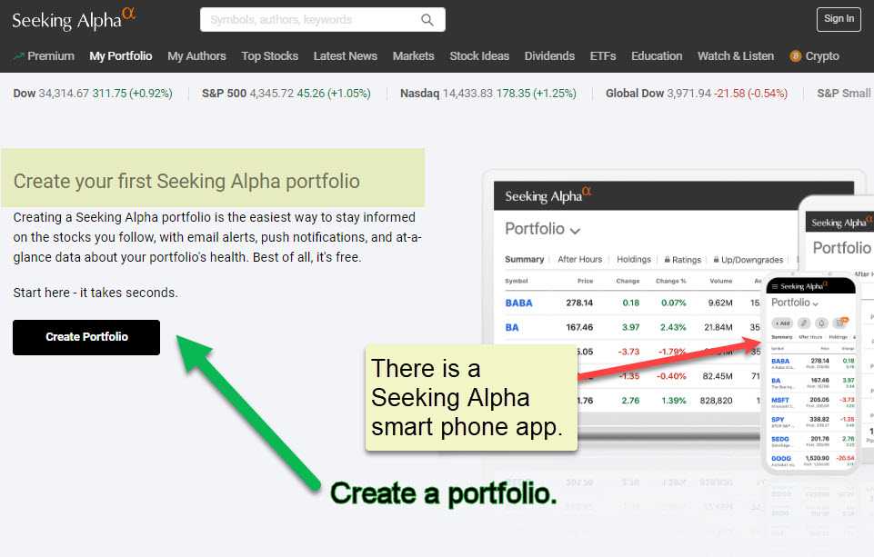 You will have to sign up for a SA account to use the portfolio. There should be no cost for doing this. Seeking Alpha also has an iPhone app and one for Android. The basic plan is sufficient for beginning investors. It includes, “Build and manage a portfolio of stocks or ETFs, Receive stock news & analysis email alerts, Receive earnings & transcripts email alerts, Read personalized news & articles, and Use our calendar to see when your stocks report.”