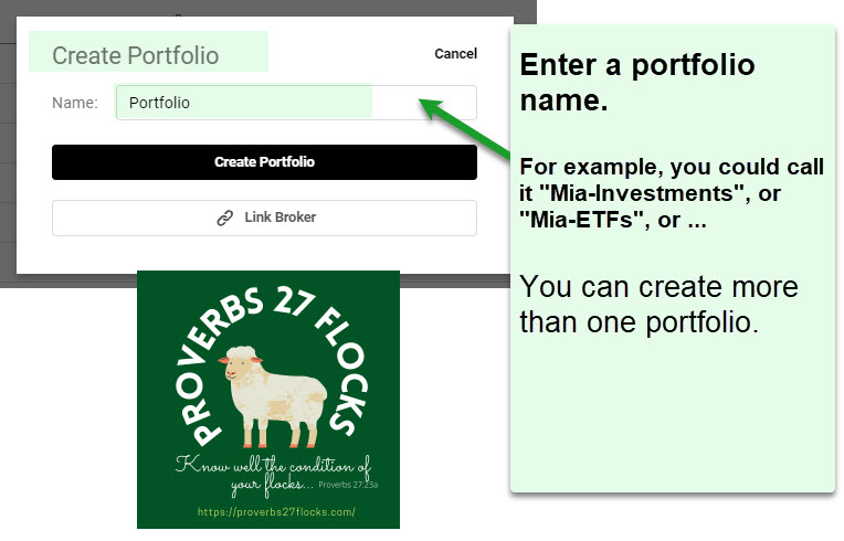 The following screen images help you see the steps to create a sample portfolio. I called the new portfolio Mia-Investments.