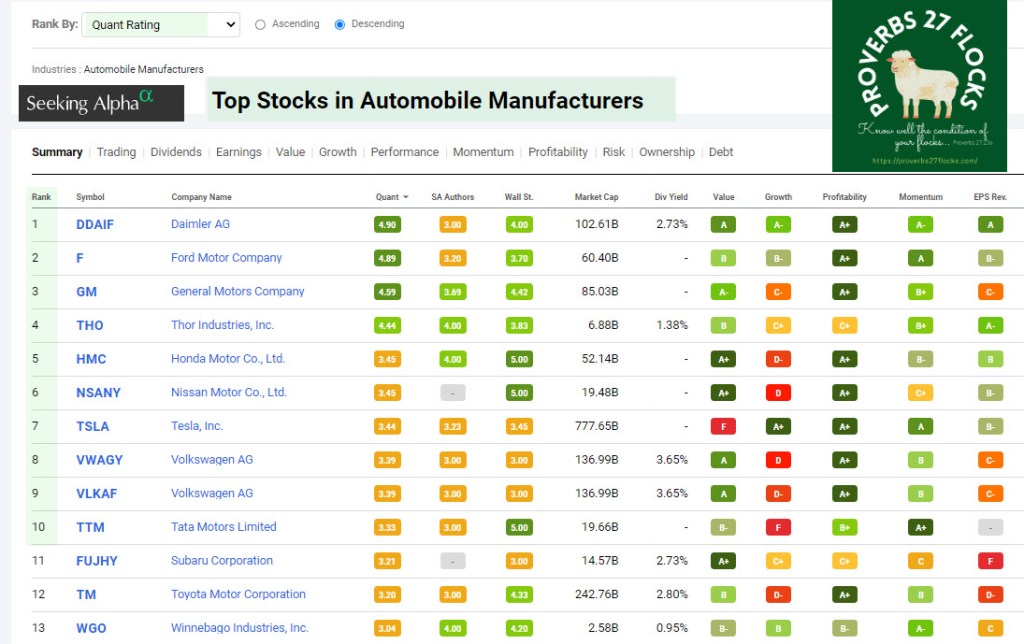When I am investing in any company, I use the Seeking Alpha tool that shows me the top stocks in their competitive arena. For example, the top stocks in Automobile Manufacturers are Daimler AG, Ford, General Motors, Thor Industries, Honda, Nissan, and then Tesla. The following image sheds some light. In general, at current prices, I am more inclined to invest in the top three now. At the present time your grandmother and I own shares of Ford.