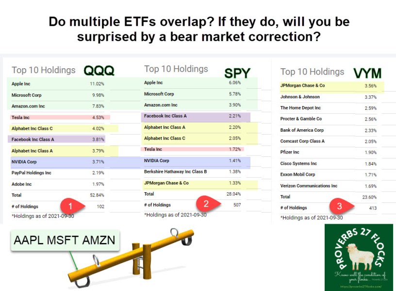 One of the most frequent and common questions that comes my way has to do with picking ETF investments. The corollary is similar: how much should I buy of each one? The first thing I always do when considering an ETF is to look at the top ten investments in the ETF. Because diversification is important, I want to know something about the holdings.
