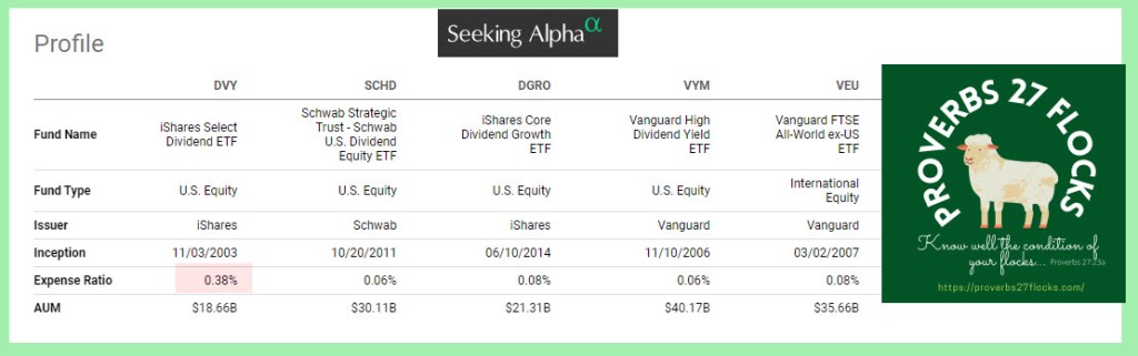 DVY has the dubious distinction of having the highest expense ratio of my favorite ETFs. When I compare DVY to VYM, DGRO, SCHD, and VEU, DVY loses. Expense ratios aren’t my only criteria, and they certainly aren’t a deal-breaker, but high dividend yields don’t justify high expense ratios.