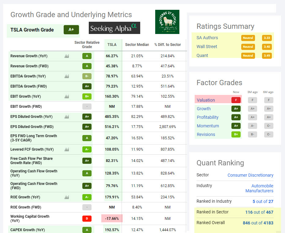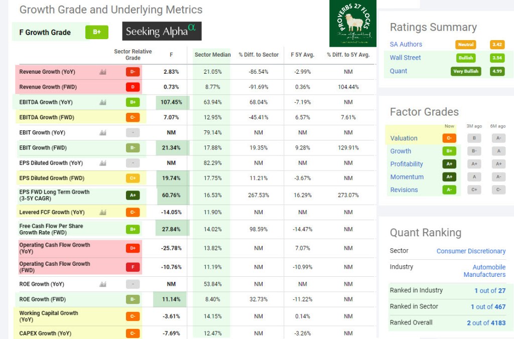 Seeking Alpha offers three sets of opinions: Their own authors, the opinions on Wall Street, and the proprietary Seeking Alpha QUANT rating. Both Wall Street and the QUANT ratings are “neutral.” That means “ho hum.” There is nothing exciting about VW from an investor’s perspective. The views about F and TSLA are much greener.