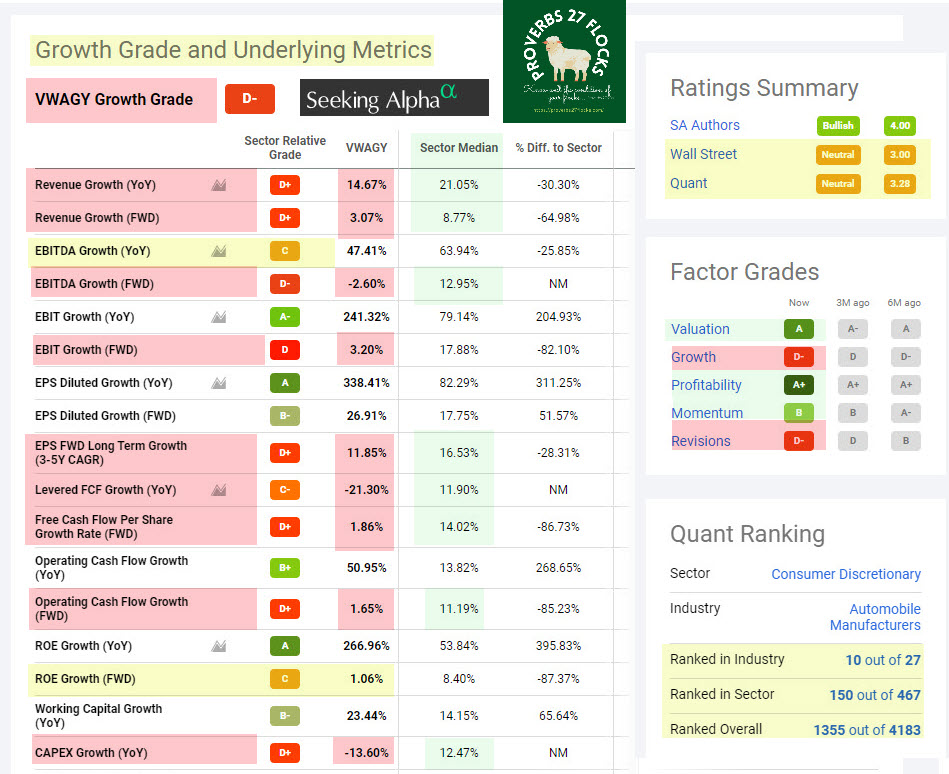FWD is “forward” revenue. Forward revenue is expected future revenue based on things the company is saying. Seeking Alpha shows that VW’s YoY and FWD revenue growth both fall below the “Sector Median.” This is worse than it sounds. It is another way of saying that they are way behind the leaders in their sector (Consumer Discretionary) and are probably way behind in their industry (Automobile Manufacturers) as well. So, investors look at a tool like Seeking Alpha, and see that VW gets a grade of D+. That is a crummy grade.