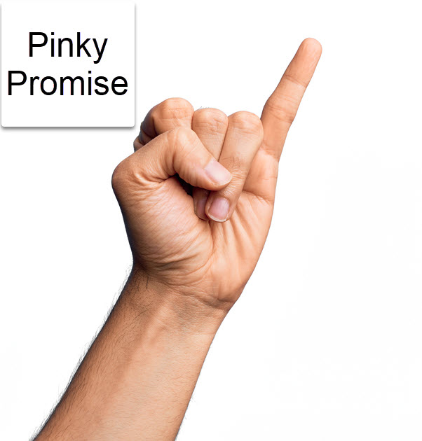 To make a pinky promise, children might lock their pinky fingers to signify that a promise has been made. The gesture is taken to signify that the person can break the finger of the one who broke the promise. I suspect most children don’t really have that level of commitment to their promises.