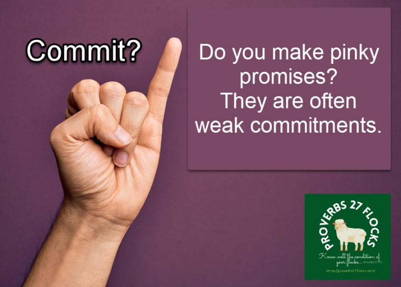 To commit has many different means, depending on the context. If you are committed, you might be fully dedicated. On the other hand, you might be committed to prison or to a mental health facility against your real wishes. Commit might also be a binding contract. For example, I sell covered call options as one way to gain investment income. That is a commitment to sell my shares of the investment in question at a specified price when the contract date arrives. Of course, I’m only committed to sell if the price of the security rises to or above the contract agreement. It isn’t a pinky promise. Pinky promises are often “if convenient” promises.