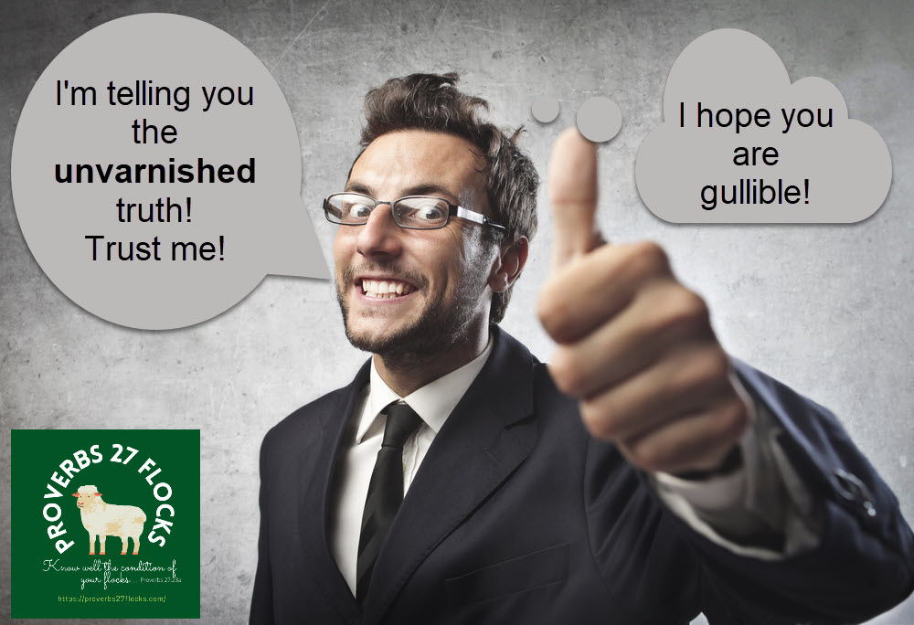 Some just like to “pull the wool over someone’s eyes.” I just don’t want you to see reality so I will deceive you to take advantage of you. In fact, we know we need to “take something with a grain of salt” because some sources aren’t reliable. We want to keep in mind that what is being said may not be completely true because the source is not a reliable source. We know we need to be skeptical of what is being said.