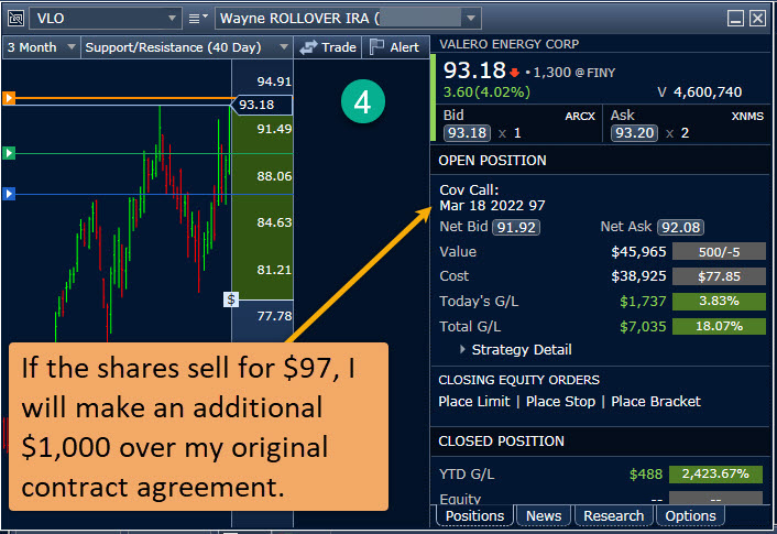My original covered call contracts were sold on Wednesday, March 9. The contract was set to expire two days later at a contract price of $95. In other words, if the VLO shares closed above $95 on Friday, March 11, I would have received $47,500. In addition, I had already been paid $106.59 for the five contracts.