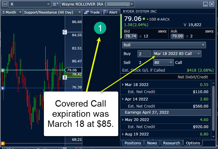 Ryder’s shares, like the shares of many companies, have been pounded down from a high of almost $85 per share. My $85/share covered call contract, as a result, will expire on March 18, which is this coming Friday. Unless something really strange happens, it makes sense to roll this covered call. The reason is simple: I think I can make more money.
