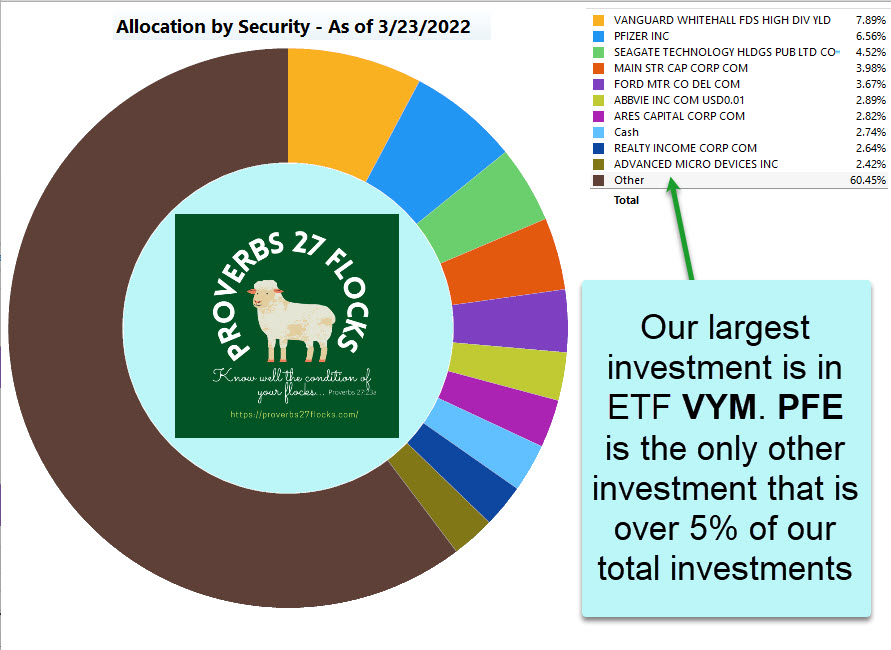 One of the things I always look for when I review another friend’s set of investments is their allocation of dollars to any single investment. Most of the time my concern is with overlap of ETFs or mutual funds, but sometimes a heavy investment in a single stock can also be a warning flag. In the accounts I manage for Cindie and me, it isn’t surprising that Pfizer (PFE) is our one investment with more than 5% of our total investment mix. However, upon further reflection, I plan to sell some of the PFE shares using covered calls.