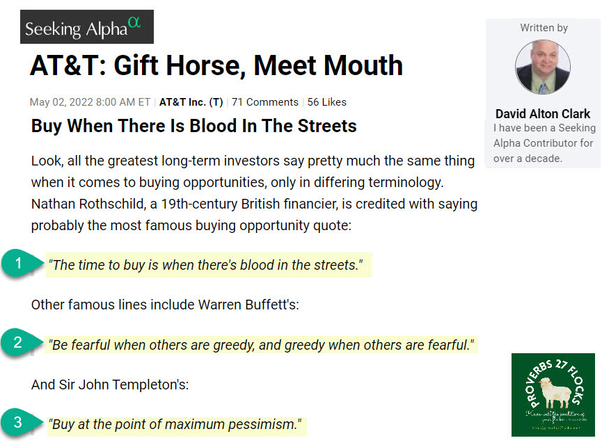 This image from Seeking Alpha explains the reason this post starts with greed, fear, blood, and pessimism. I am not a fan of greed, fear, shedding blood or pessimism. However, there are times when others have these emotions or feelings, and those times can be opportunities for the wise investor.