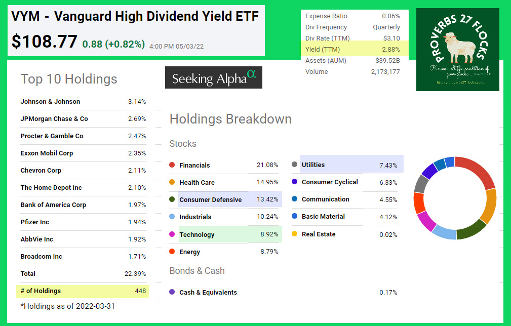 We must be careful. VIG is more heavily invested in the top ten stocks at 28.8% in the top ten while VYM clocks in at 22.4% in the top ten. If the top ten suffer disproportionately, it can make a difference in the price performance of the ETF. However, for the long-term investor this is not a primary concern.