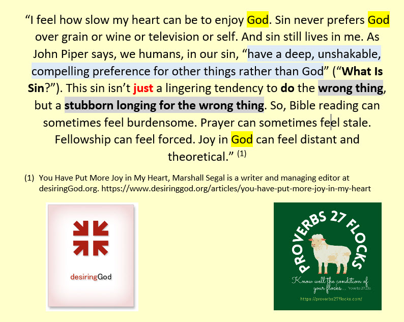 “I feel how slow my heart can be to enjoy God. Sin never prefers God over grain or wine or television or self. And sin still lives in me. As John Piper says, we humans, in our sin, “have a deep, unshakable, compelling preference for other things rather than God” (“What Is Sin?”). This sin isn’t just a lingering tendency to do the wrong thing, but a stubborn longing for the wrong thing. So, Bible reading can sometimes feel burdensome. Prayer can sometimes feel stale. Fellowship can feel forced. Joy in God can feel distant and theoretical.” (1)