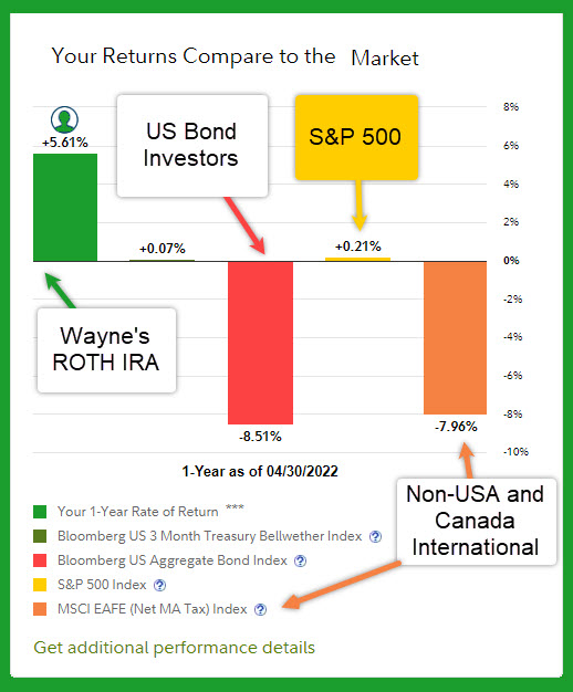 The image above shows that my ROTH is still up over 5% in the last twelve months. Of course, this could change tomorrow or next month. The purpose of this image is to compare my ROTH IRA returns with US Treasury’s, the bond index, the S&P 500 (top-heavy with just a few big companies), and the MSCI EAFE index (international investment mix that excludes the USA and Canada.) How do the bond investors feel about the last twelve months? When interest rates rise, bonds are no longer as attractive because bonds do not have FDIC insurance.