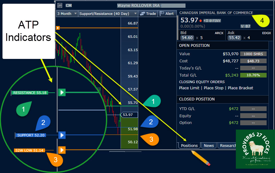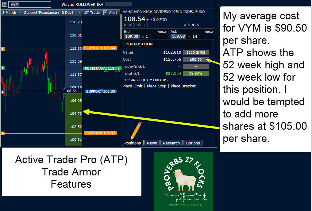 The primary ATP tool that I use anytime I am on ATP is Trade Armor. Trade Armor can help you see many important data elements about a stock or ETF you own or one that you are considering buying. This includes indicators for 52-week high stock prices, 52-week low, resistance, support, cost basis, current G/L (profit or loss), information about any capital gains or options income, average cost of your shares, expense ratios, earnings date and information, dividend-focused information, and even the top holdings if you are looking at an ETF.