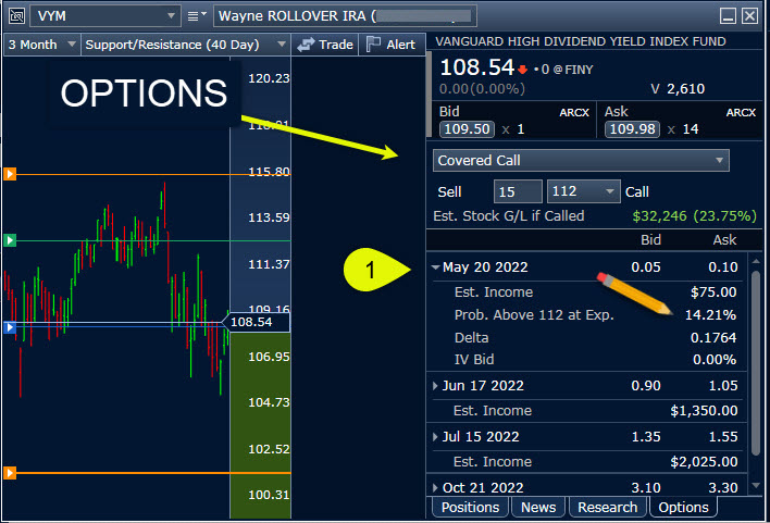 When I want to consider doing an options trade, ATP Trade Armor is the best tool for the job. Most of my options trades are covered calls, followed by cash covered puts and rolls. It is also easy to see if the position doesn’t have options, if the options are monthly or weekly, and the estimated income if I sell an option. In the following image I am considering selling a covered call of fifteen contracts (1,500 shares of VYM) on various monthly dates. I could make $4,650 in a single trade if I was willing to sell a covered call on 1,500 VYM shares at $112 per share. Of course, I have to keep the shares until October 21, 2022, if someone buys my contract. I would not enter an options trade that expires more than a month out, so I might be tempted to sell the contract for June 17.
