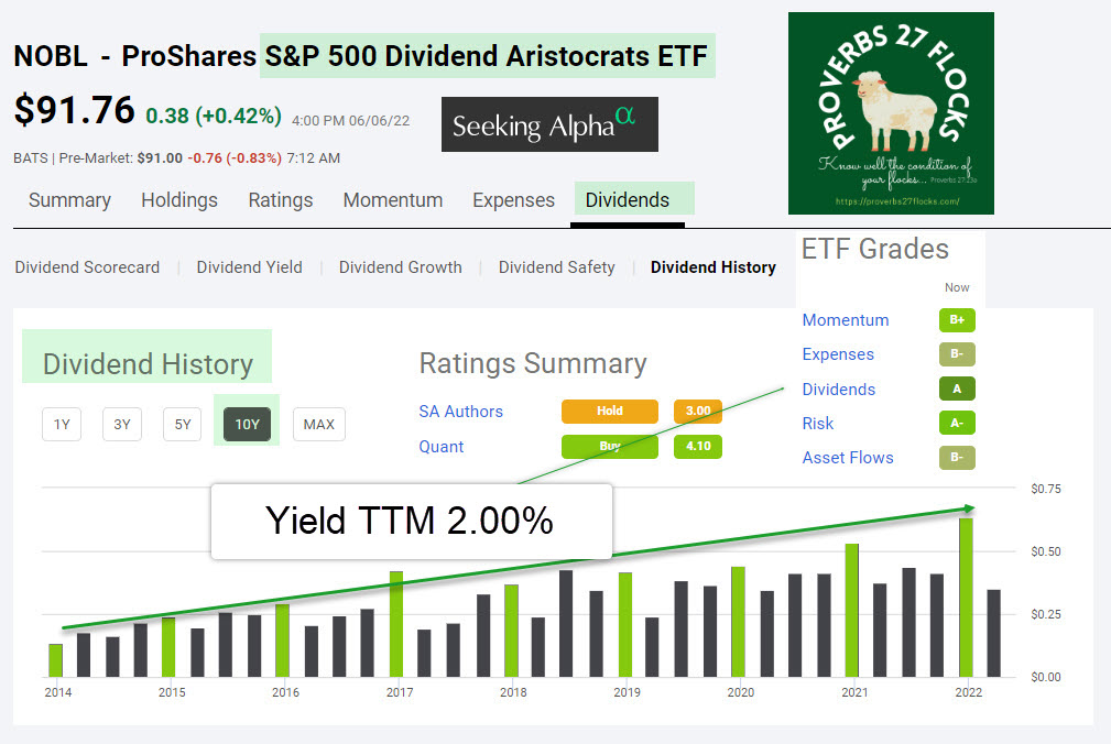 Another interesting dividend ETF is ProShares S&P 500 Dividend Aristocrats ETF.  I found this ETF using a faster search. In the Seeking Alpha search box I typed “Dividend Aristocrats.” The following image shows the dividend growth path for NOBL. This ETF has 65 holdings, but the top ten only make up about 18% of the total. This, I believe, makes it far less risky if one of the 65 gets hit with bad news.