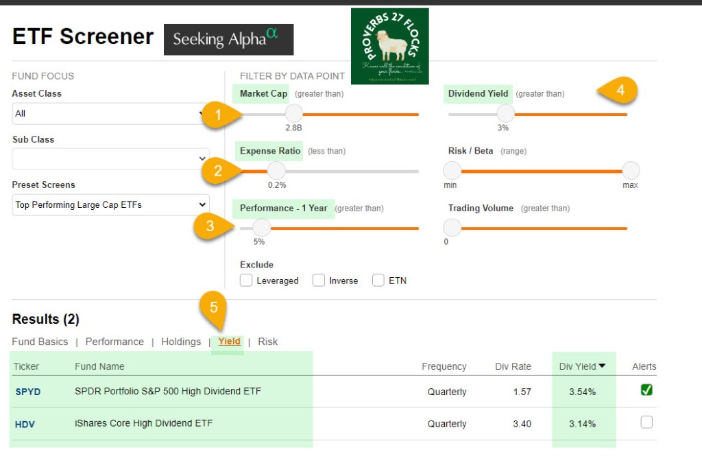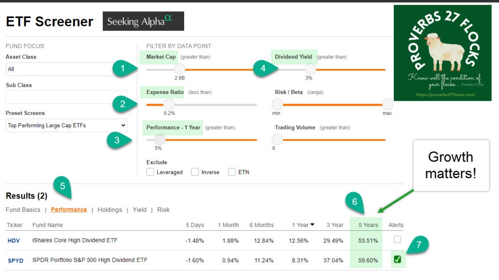 Using SA’s ETF screener, I found two ETFs that might be worthy of consideration. They are HDV and SPYD. Both are “High Dividend Yield” investments. However, don’t make the mistake of thinking that “high dividend” also means “dividend growth.” To illustrate the tool, I moved the sliders for “Market Cap”, “Dividend Yield”, “Expense Ratio”, and “Performance 1 Year” to suit my preferences. I prefer a decent yield and a low expense ratio. Also note that I am only looking at Large-Cap ETFs. The first image is the default result and the second one shows the 5-year performance. If an investment can provide 8-10% growth per year, I am usually interested.