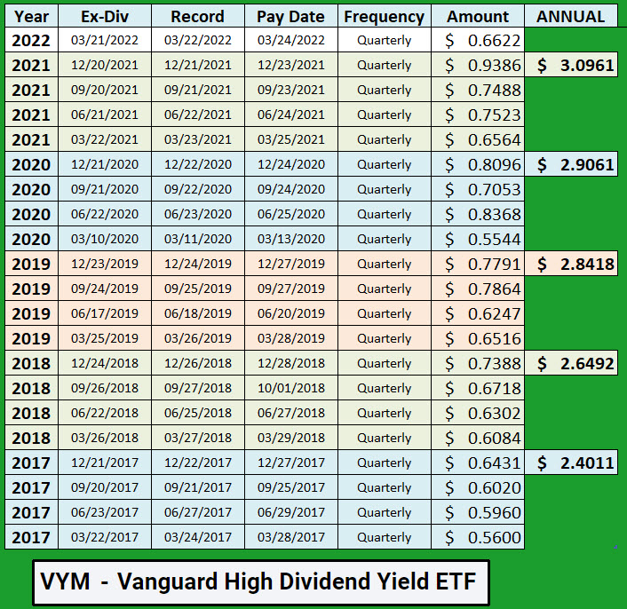 VYM screen shot showing second quarter dividend announcement dates and Ex-Dividend dates.