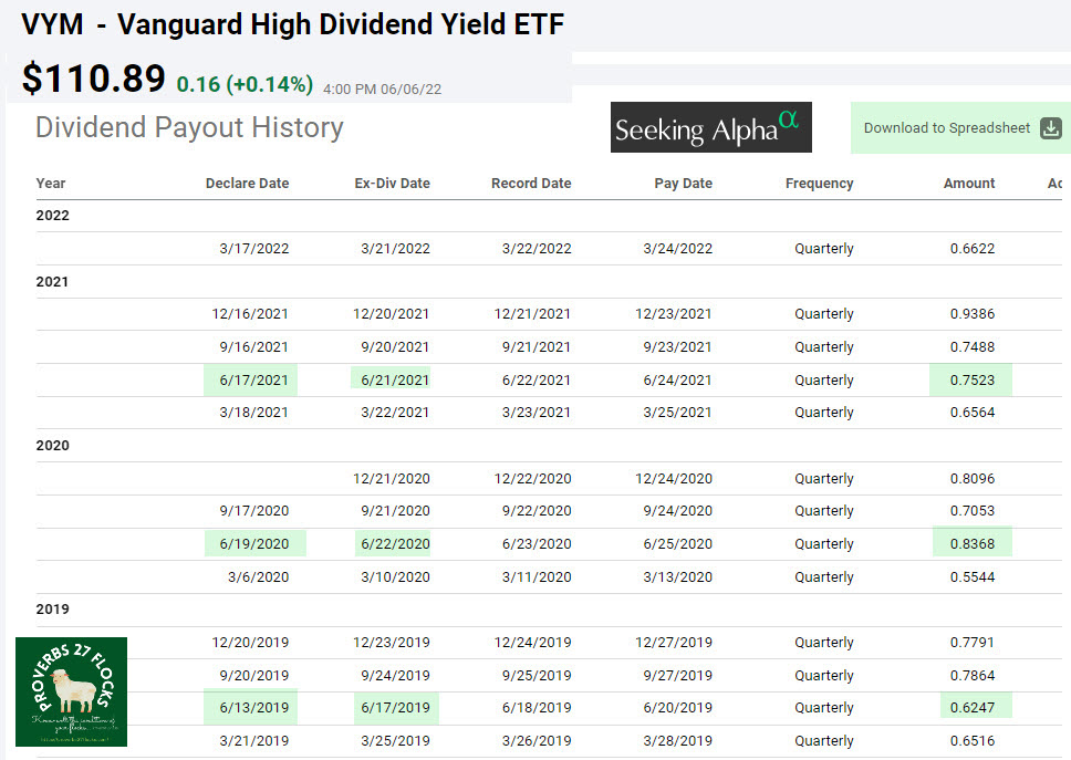 Yet another nice feature of Seeking Alpha is the ability to see “Dividend History.” You can also download dividend history for ease of analysis in a spreadsheet. For example, the first image is just the screen capture of the VYM dividend history. Notice that the second quarter dividend is normally announced in mid-June. The reason this is important is that the time between the dividend announcement and the Ex-Dividend date is just a couple of days. Therefore, if I want the next VYM dividend I should probably buy shares before June 10th.