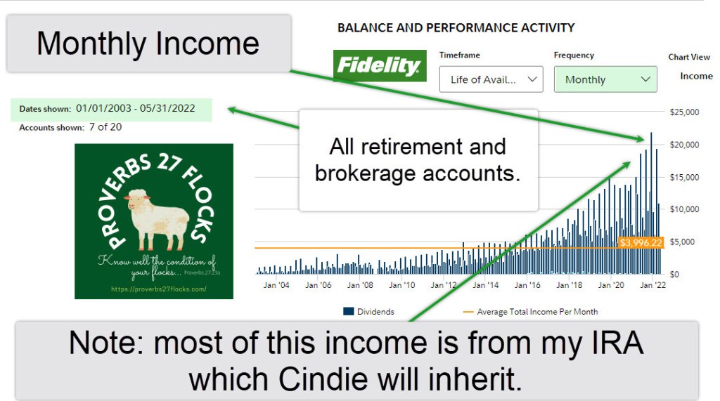 Because our investments, primarily those in my ROTH and Traditional IRA accounts pay dividends, and those dividends are growing each year, there is no need for me to purchase a life insurance policy. Cindie will have more than sufficient income to cover her needs, generous charitable giving, increasing costs due to health care, and a good buffer to keep inflation from creating a mess.