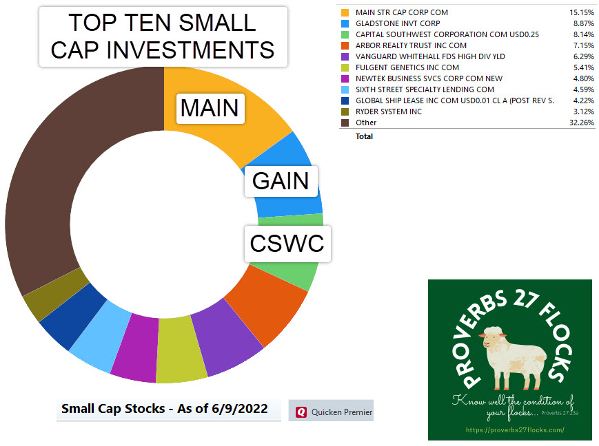 The simple answer is that I want more income and I am willing to sacrifice growth to get the income now. So, for example, BDCs like MAIN and GAIN pay a monthly dividend. The price of the shares is very volatile, but I understand that they are subject to all sorts of news that drives the prices of the shares up and down. The following illustration, from Quicken, shows the allocations of these top ten within the small cap category. These percentages are NOT the percentage of our total invested capital. My favorites, as you can probably see by allocation of funds, are MAIN, GAIN, and CSWC.