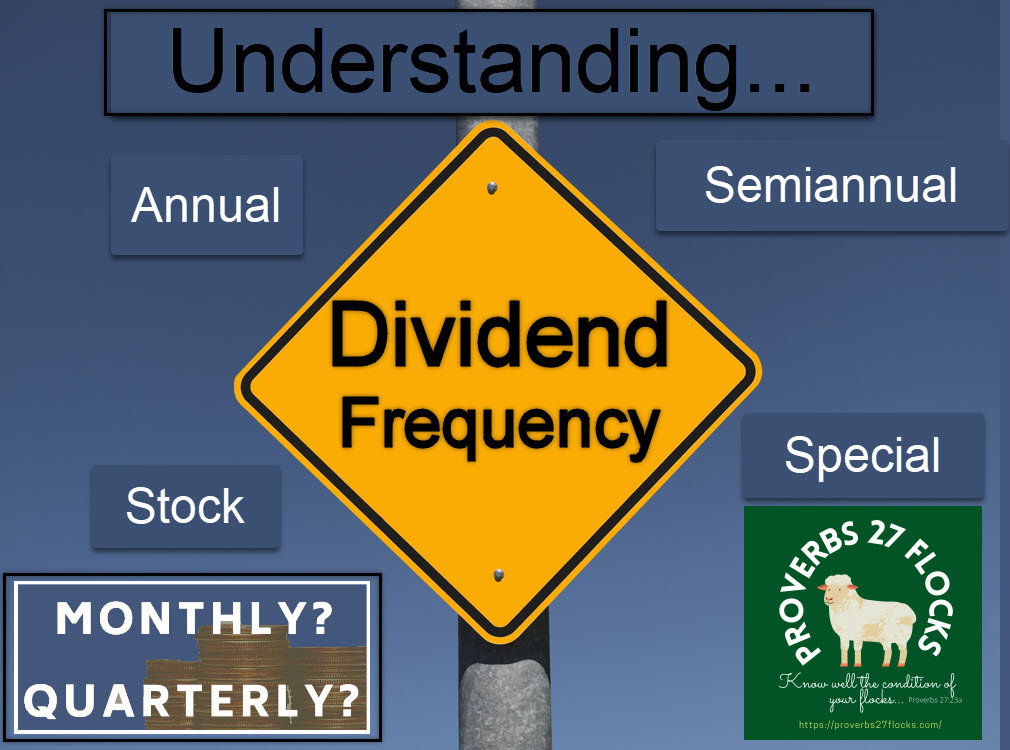 The dividend frequency varies across investments. Dividends, generally issued as cash payments most of the time, but sometimes a company will issue additional stock shares as a special dividend. Most often, cash dividends are often paid monthly, quarterly, biannually, or annually. The managers can also choose to pay a special dividend, which can happen at any time, but is generally hard to expect in advance.