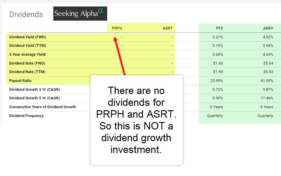 One downside, for a dividend growth investor, is that small-cap stocks generally do not pay a dividend. I hold 1,500 shares of ASRT, and I was thinking about buying more when I found PRPH on Seeking Alpha.