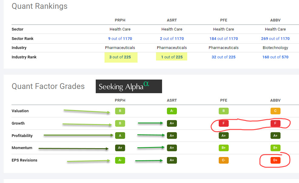 Another reason I was tempted by PRPH has to do with the success I have had in using the Seeking Alpha Quant ratings. Here are some images to help you understand the comparison of PRPH, ASRT, PFE, and ABBV.