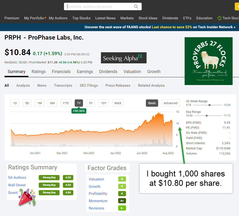 As tempting as it is to buy more ASRT, I decided diversification was a better approach. So I bought 1,000 shares of PRPH at $10.80 per share. My total cost basis $10,799.96. There is another reason that I bought yesterday. PRPH has upcoming quarter’s earnings that have an announce date of 08/11/2022 (Pre-Market). That means good news could quickly propel the shares higher, but it also means that bad news could quickly make my investment worth less. While ten thousand dollars is not small change, it isn’t going to break my traditional IRA, as PRPH is much less than 1% of the total investments in my traditional IRA. If you are buying an investment, always keep an eye on the percentage of the total when adding a new investment.