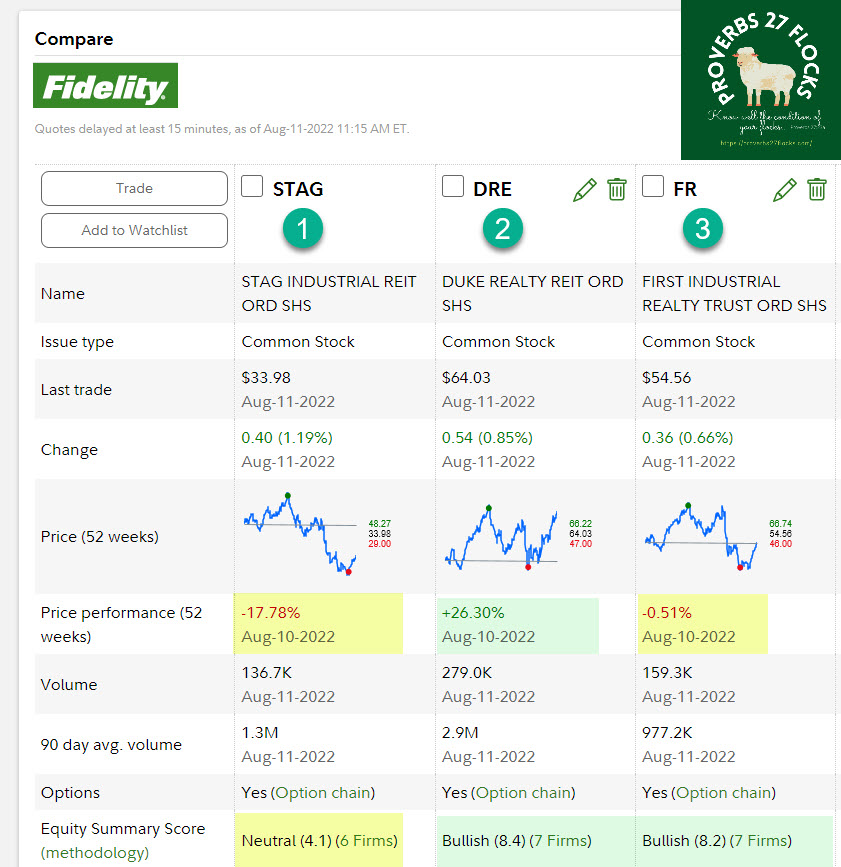 Wall Street analysts are a crazy bunch. Most of them are really hesitant to recommend selling an investment. Furthermore, they use Wall Street “speak” when giving their recommendations. They might say you should “over-weight” a stock. They might also say “Equal weight” the investment. They might be more straightforward and say “buy.” You might guess that most of these are positive recommendations. However, they also provide a price target. If something is trading at $33.75 (like STAG), they might suggest a target price of $41. However, they are revising a former recommendation where they thought the target price would be $43. Above are three recent views of STAG, FR, and DRE.