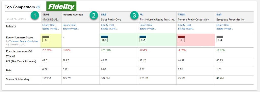One nice thing about Seeking Alpha is the ability to quickly see the “top ten” QUANT-rated stocks. As you can see from the following illustration, DRE is in third place, FR is in 6th place, and STAG comes in at 7th. However, always pay attention to “Valuation.” If it is red, then it means the stock price at the present time seems high. That means there could be a pullback. Perhaps I would add DRE and/or FR if that were to happen.