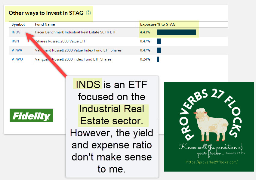 Fidelity has some reputable analysts that provide their buy, hold, and sell recommendations. These can change quickly, or they can creep up and down. While I usually look at the Fidelity equity summary score, I usually want to see the Seeking Alpha QUANT rating as well. While I was on Fidelity, I also noticed that you could see ETFs that hold a stock like STAG. So I looked at INDS (Pacer Benchmark Industrial Real Estate SCTR ETF) and decided it was too scattered with 21 holdings. I want a more focused approach. Furthermore, the yield on INDS is a paltry 1.61% and the expense ratio is 0.60%. That makes it too expensive and a poor source of income. The dividend growth rate is also substandard.