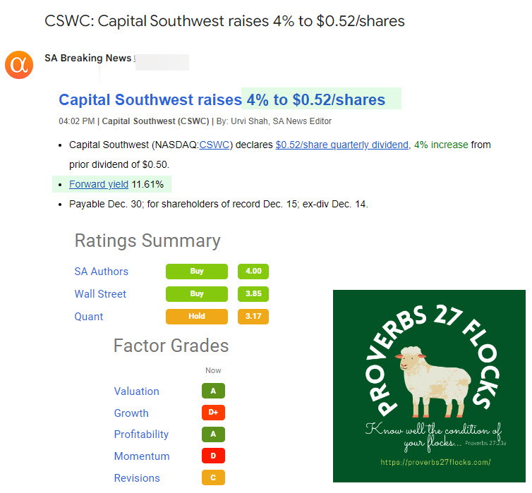 Cindie and I hold 2,900 shares of CSWC as a long-term investment. Therefore, we will receive $1,508 in dividends on December 30, 2022. Estimated annual income from this investment (dividends only) is $6,032.