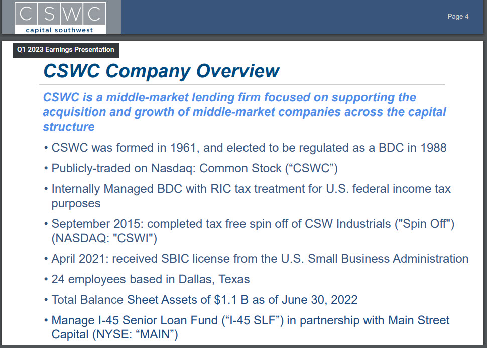 Perhaps the best way to show some of the reasons I like CSWC is to share four slides from a CSWC Investor Presentation: