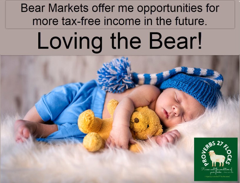 Let me repeat what I said earlier: I love the current bear because I don’t have to make any income, investing, or giving decisions based on sentiment. Furthermore, the bear market sets me up for some great ROTH conversions! This gives us more tax-free income in the future.
