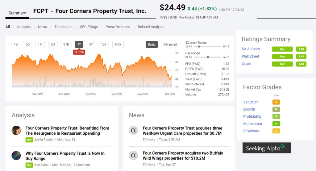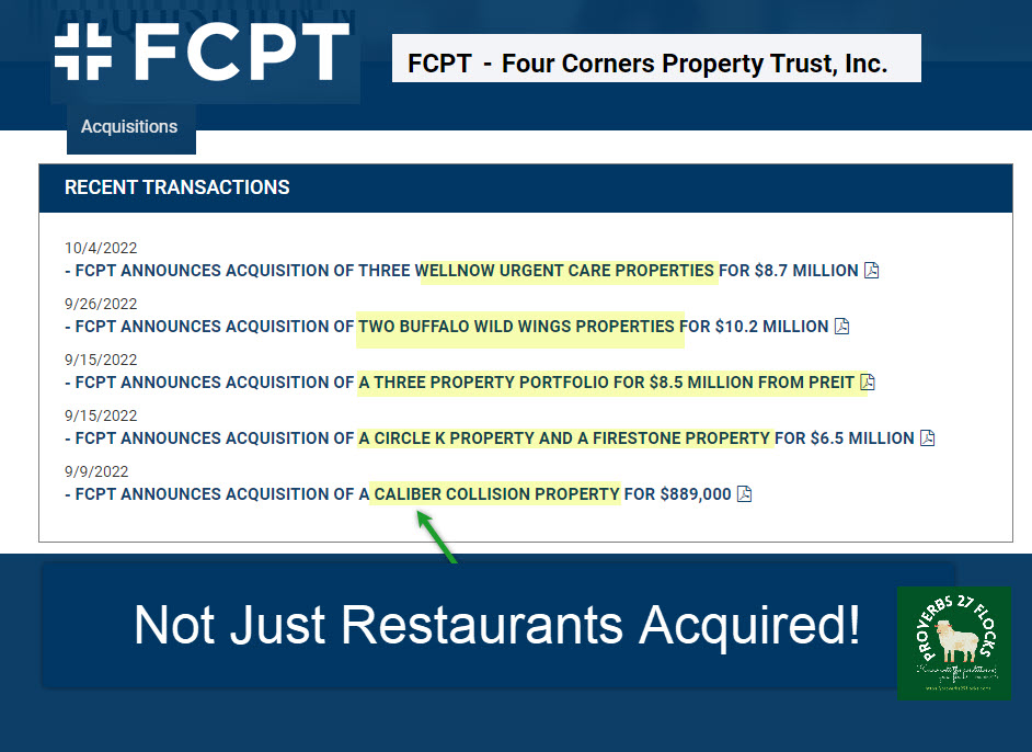 Sep. 15, 2022 Four Corners Property Trust (NYSE:FCPT) said Thursday it acquired a Circle K property and a Firestone property in Illinois for $6.5M. The properties are occupied under long-term, triple net leases with a weighted average of 5 years of term remaining. The deal was priced at a 7% cap rate.