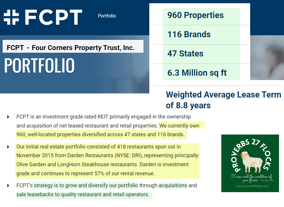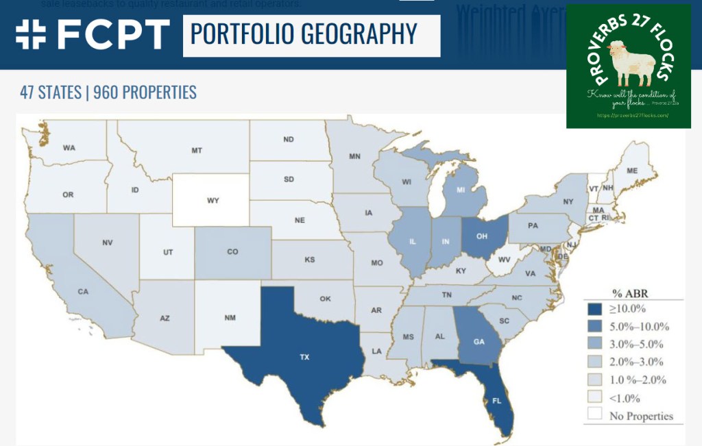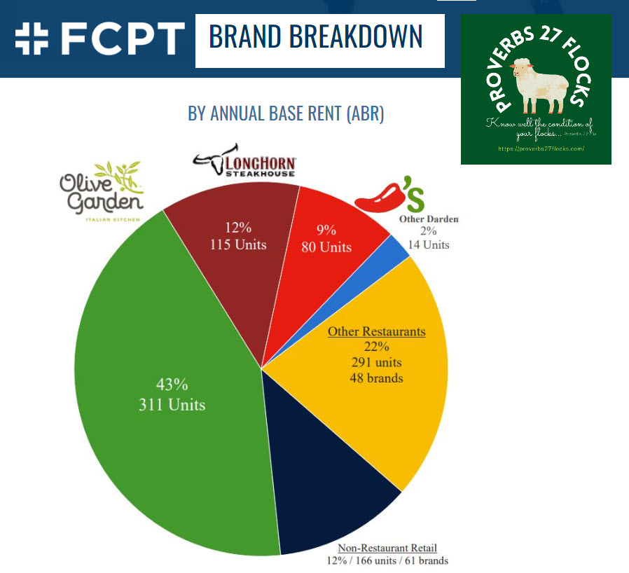 Diversification always matters. I look for diversification in brands, geography, and strategy. FCPT has a good menu for diversification.