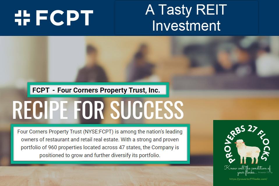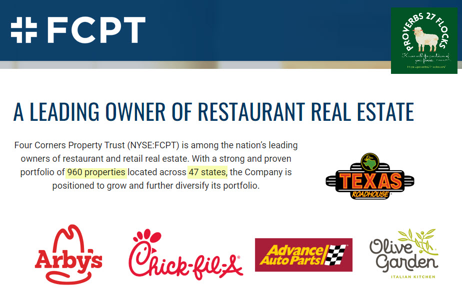 FCPT, headquartered in Mill Valley, CA, is a real estate investment trust primarily engaged in the acquisition and leasing of restaurant properties. The Company seeks to grow its portfolio by acquiring additional real estate to lease, on a net basis, for use in the restaurant and retail industries. And growing portfolios produce growing revenues and that produces growing dividends – or at least it should!