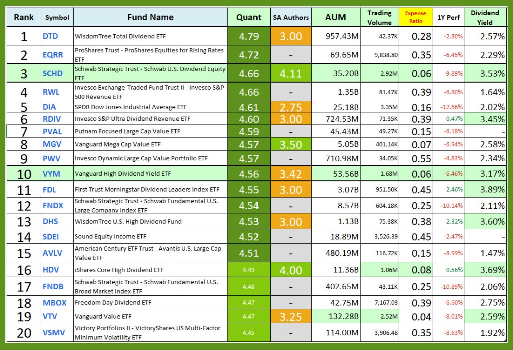 Seeking Alpha’s QUANT score and the ranking of ETFs within a category helps separate the wheat from the chaff. In general, you want an ETF with billions of dollars in assets under management. You also want a QUANT score that is 4.50 or higher. Both VYM and SCHD satisfy these requirements. In addition both have rational expense ratios and sensible dividend yields. I don’t view VYM’s number ten ranking as a bad thing. There is greater risk with an ETF like EQRR because the fund is so small.