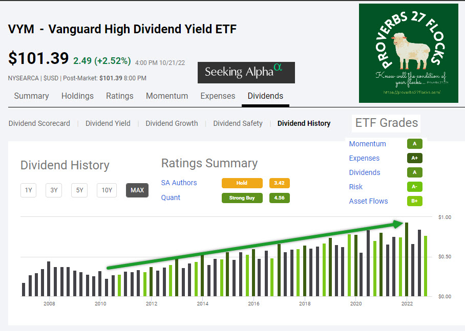 A far better focus is to think about investments that are likely to perform well over time and that require minimum time for the investor. Some ETFs satisfy those two basic requirements. One ETF I often mention is the Vanguard High Dividend Yield ETF. The ticker symbol is VYM. I want to share six images from Seeking Alpha to help you understand why I recommend that you purchase more shares of VYM in the next three months. Another good choice is SCHD.