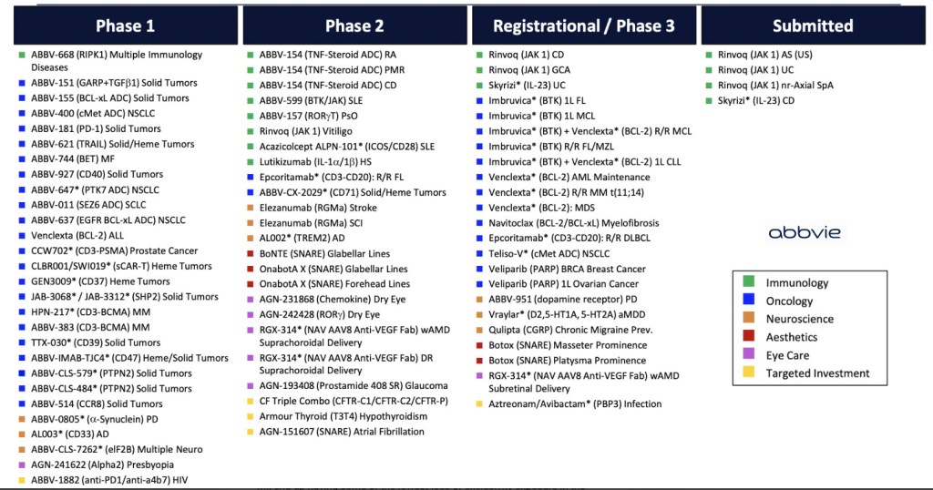 AbbVie Inc. discovers, develops, manufactures, and sells pharmaceuticals in the worldwide. The company offers HUMIRA, a therapy administered as an injection for autoimmune and intestinal Behçet’s diseases; SKYRIZI to treat moderate to severe plaque psoriasis in adults; RINVOQ, a JAK inhibitor for the treatment of moderate to severe active rheumatoid arthritis in adult patients; IMBRUVICA to treat adult patients with chronic lymphocytic leukemia (CLL), small lymphocytic lymphoma (SLL), and VENCLEXTA, a BCL-2 inhibitor used to treat adults with CLL or SLL; and MAVYRET to treat patients with chronic HCV genotype 1-6 infection. It also provides CREON, a pancreatic enzyme therapy for exocrine pancreatic insufficiency; Synthroid used in the treatment of hypothyroidism; Linzess/Constella to treat irritable bowel syndrome with constipation and chronic idiopathic constipation; Lupron for the palliative treatment of advanced prostate cancer, endometriosis and central precocious puberty, and patients with anemia caused by uterine fibroids; and Botox therapeutic. In addition, the company offers ORILISSA, a nonpeptide small molecule gonadotropin-releasing hormone antagonist for women with moderate to severe endometriosis pain; Duopa and Duodopa, a levodopa-carbidopa intestinal gel to treat Parkinson’s disease; Lumigan/Ganfort, a bimatoprost ophthalmic solution for the reduction of elevated intraocular pressure (IOP) in patients with open angle glaucoma (OAG) or ocular hypertension; Ubrelvy to treat migraine with or without aura in adults; Alphagan/ Combigan, an alpha-adrenergic receptor agonist for the reduction of IOP in patients with OAG; and Restasis, a calcineurin inhibitor immunosuppressant to increase tear production, as well as other eye care products. AbbVie Inc. has a research collaboration with Dragonfly Therapeutics, Inc. The company was incorporated in 2012 and is headquartered in North Chicago, Illinois. Link to ABBV. Link to ABBV Investor Presentations. Link to ABBV Investors.