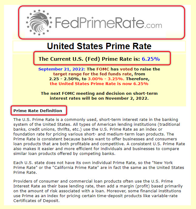 “Now that the Federal Reserve has been raising the United States prime rate, the current U.S. (Fed) Prime Rate is: 6.25%. As of September 21, 2022: The FOMC has voted to raise the target range for the fed funds rate, from 2.25 – 2.50%, to 3.00% – 3.25%. Therefore, the United States Prime Rate is now 6.25%. The next FOMC meeting and decision on short-term interest rates will be on November 2, 2022.” SOURCE: LINK to FedPrimeRate