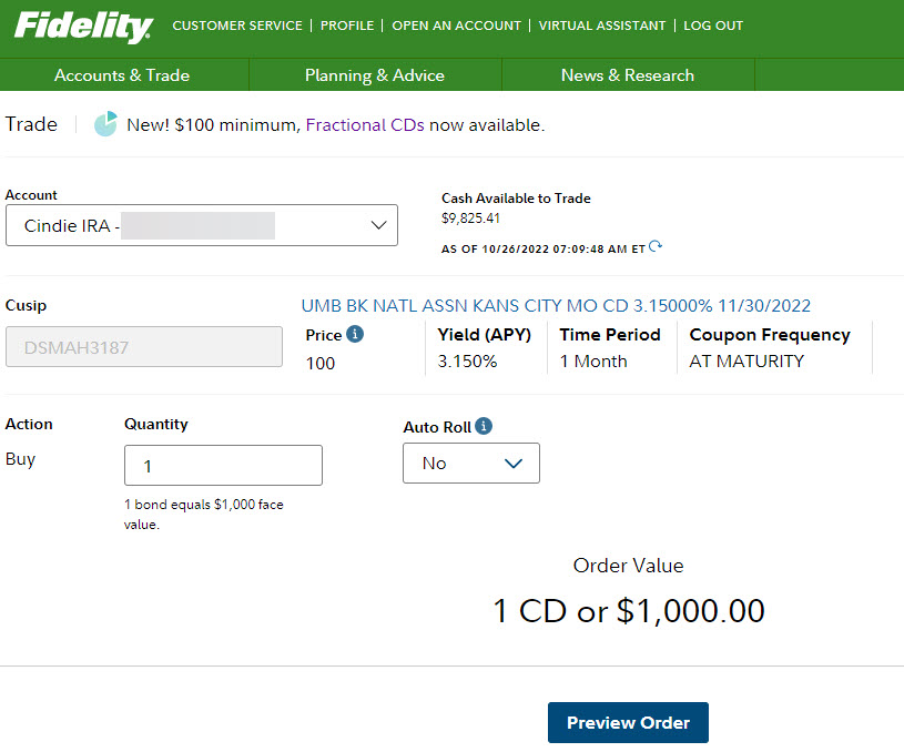 You will need to pick the account for the buy, the number of CDs (1 is $1,000, 2 is $2,000, etc.) and whether or not you want to “Auto Roll.” I always say “No” for auto roll because I want to pick the CD that I want to purchase, or I may want the cash for some need. Once you made your selections, click “Preview Order.”